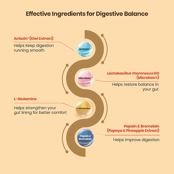 AGEasy Gut Balance is a thoughtfully formulated daily digestive wellness supplement designed to support your gut’s natural harmony and comfort. At the core of its advanced formula is ACTAZIN®, a premium green kiwifruit extract rich in natural fiber and the enzyme actinidin, which has been clinically associated with enhanced digestion, reduced bloating, improved stool quality, and gentle support for regular bowel movements — promoting overall digestive equilibrium without harsh laxatives. ACTAZIN® also provides prebiotic nourishment that helps beneficial gut bacteria thrive, aiding nutrient absorption and fostering a balanced microbiome for long-term digestive resilience.