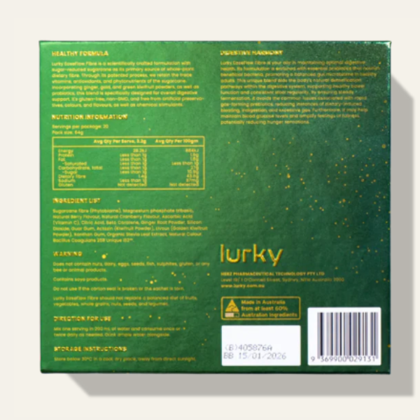 Lurky’s EaseFlow Fibre Pro is a premium digestive wellness formula engineered for those seeking natural, science-backed relief from IBS symptoms, bloating, and irregularity. This advanced blend integrates ACTAZIN®, a clinically studied green kiwifruit powder known for its unique composition of dietary fibre, enzymes, polyphenols, and natural acids that work synergistically to support normal bowel function. In addition to ACTAZIN®, EaseFlow Fibre Pro includes gentle prebiotics, probiotics, golden and green kiwifruit powders, virgin sugarcane fibre, and ginger root—all curated to soothe digestion, restore gut balance, and promote comfort without harsh stimulants.